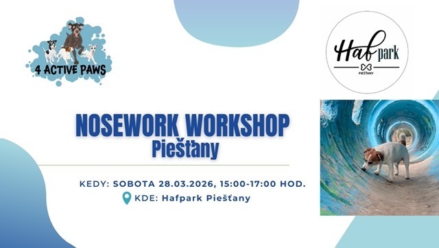 Každý psík rád čuchá a ešte račej, keď pri tom dostane množstvo odmien! Ak chcete vyskúšať so svojím psíkom niečo nové a zábavné, pridajte sa k nám na Nosework Workshop 4 Active Paws, ktorý sa uskutoční 28. marca o 15:00 v Hafparku Piešťany!